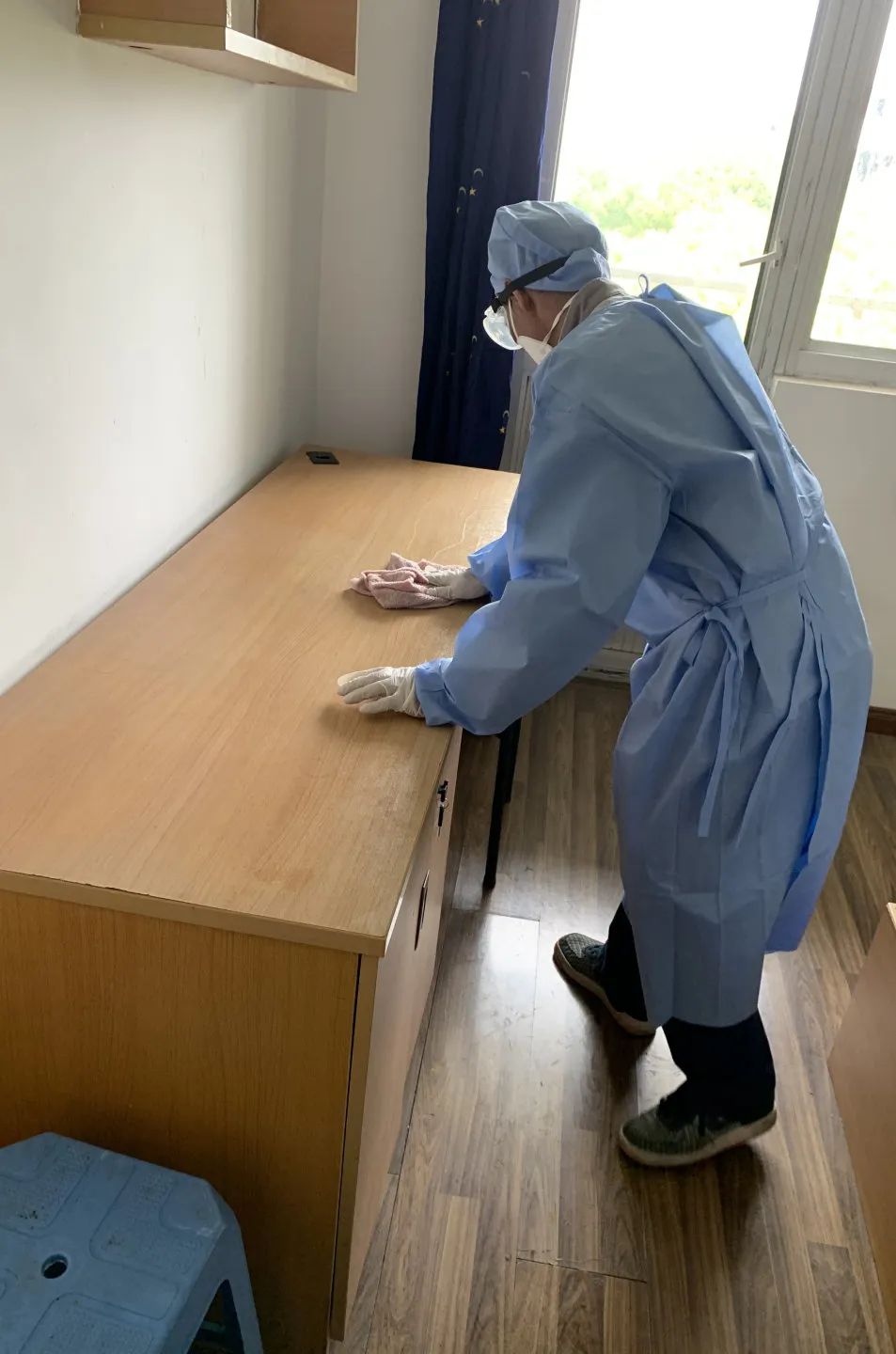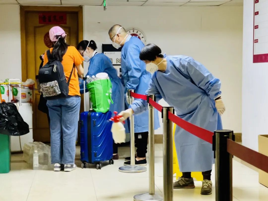 陈群秀阿姨作为临时隔离观察点的宿管员,时刻准备着投入高强度“战斗”,一旦出现异常情况,及时响应。四月的一天,她接到紧急通知,有60位学生即将从其他楼幢转移至此,在时间紧、任务重的情况下,凭借熟练的业务能力、精准的台账记录及楼内充分的生活物资储备,她积极协助上级迅速完成房间安排和住宿准备,确保学生以最短的时间有序入住。从住宿名单的核对,到楼幢公共区域的消毒,从照顾学生住宿期间各类生活需求,到学生转运离开后迅速开展房间消杀、床上用品更新,她和物业团队的同事齐心协力,共同协作,一直忙到下一批学生入住。
