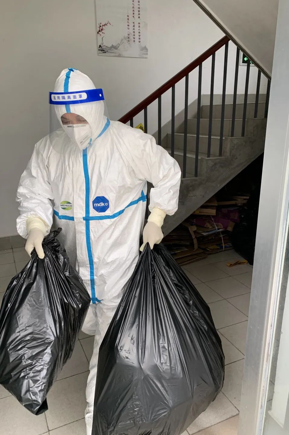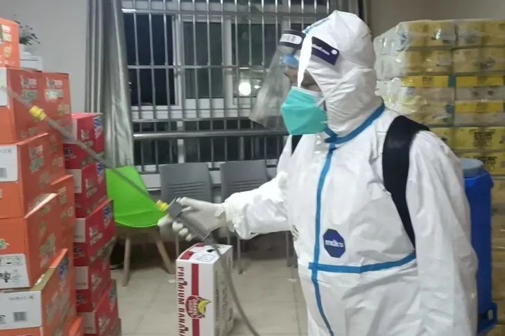 这些天来,他们要对运往公寓的大批物资进行消杀,对潜伏在公寓里的各处风险点进行喷洒,穿梭于一批又一批物资间,行走在一层又一层楼道里,他们穿着闷热的防护服, 背着超20kg的喷雾器,在充满浓郁消毒剂气味的空间内连续数小时负重工作,既要仔仔细细地进行全方位、无死角的消杀,还要顶得住消毒剂的刺鼻气味,更有可能面对着潜伏在身边却又看不见摸不着的病毒,但他们早已将个人的安危置之度外。他们肩上扛的不是消毒工具,而是物业人的责任和应对疫情勇往直前的态度。