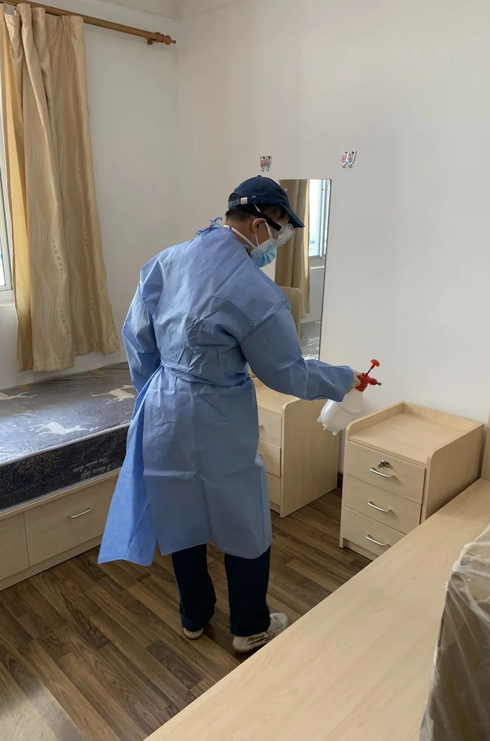 师傅们表示:“我们消杀人员疫情防控工作必须严格仔细,完成领导交给我们的任务,守护好公寓学生的安全!”