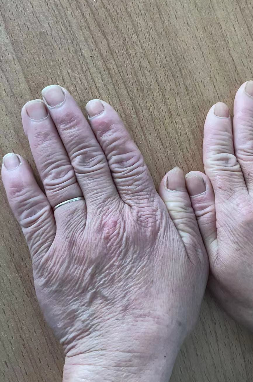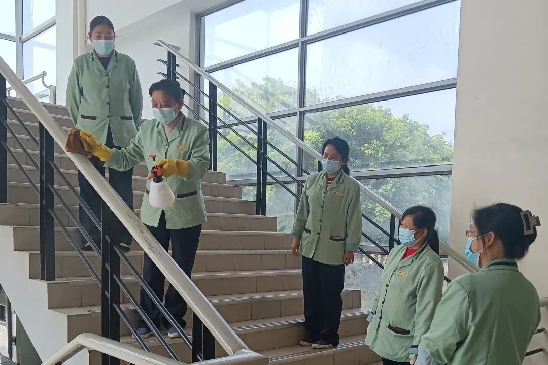 打扫卫生、清理垃圾虽说是保洁师傅们的本职工作,但突如其来的疫情大大加重了他们的工作量,师傅们有时忙到连简单的工作餐都不能按时吃上,晚上下班往往也是繁星高挂的时候。每次工作结束,保洁师傅们都大汗淋漓,疲惫不堪,挂耳式口罩勒得耳朵又紫又疼,摘下口罩的时候,深深的压痕显现在脸上。由于每天不停地配置消毒水,反复用肥皂、消毒液洗手,手背上都布满了裂纹,甚至双手过敏、红肿发痒、钻心地疼,但他们都没当回事。“轻伤不下火线”“我能行,我去”,这是他们常挂在嘴边的话,他们没有怨言,不讲条件,不计得失,加班加点,危险和疲劳没有影响保质保量完成消毒工作和保洁工作。