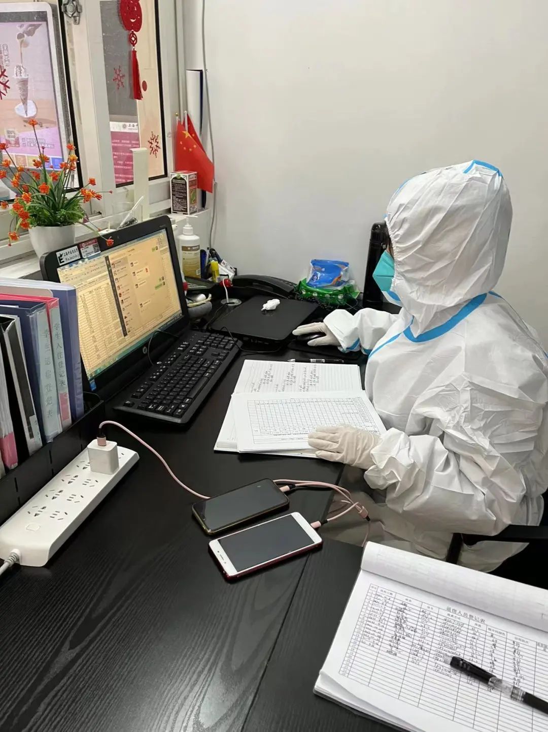 徐汇宿舍区物业的姚琴不仅每日负责文件收发、上传下达、物资发放工作,还认真督促员工按时完成核酸检测和抗原自测,定时报告公寓消杀、物资储备情况,做好记录和反馈,确保事事到位,每一个环节无差错。有段时间天气骤变,温差较大,她担心师傅们晚上受凉,特地送去了棉被。疫情期间的工作虽然辛苦,但同事间的关怀互助,温暖着每个人的心,彼此的距离也更加亲近了。