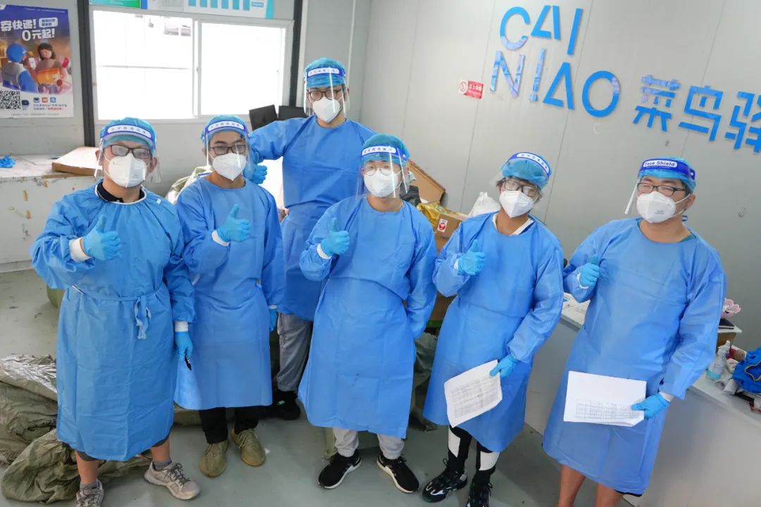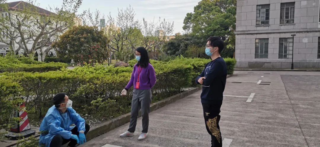 部分片区长合影(从左往右:杨艳琴、王长波、庄瑜、谢炜、郁悦)在毕业花栽种的那天,有位老师发过这样一条朋友圈:等你熬过所有的“苦”,就会遇见所有的甜。对我而言,亦是在河西五十多天片区工作的总结。这丝甜来自三馆前盛开的杜鹃、食堂里供应购买的“老干妈”,还有共青场吹来的微风。河西的首批驻楼辅导员是来自心理与认知科学学院的兼职辅导员汪红英和国际汉语文化学院的专职辅导员王佳宁,小雨的夜晚,带着行李箱、电脑,没有犹豫地走入封控楼宇,开始了14天的工作。两位老师迅速建立了楼长、层长和寝室长的层级管理模式,为层长建群,定期开会沟通并听取意见,在群里轮流为大家答疑解惑,协助宿管一起分发盒饭、组织核酸采样、协调志愿者工作。她们也曾因为疫情的反复而辗转不能入眠,凌晨4点,佳宁老师发了一条朋友圈,才发现大家都未入眠,一句“还醒着?”开启了语音聊天模式,我们互发了几条幽默视频,鼓励打气,聊着聊着,一起抱着手机进入梦乡。韦宇轶老师带领下的宿管团队,和两位辅导员配合默契,全方位做好后勤保障工作,搬饭、送饭、湿垃圾的清运、公共区域的消毒,直到解封那天,我才知道,韦老师上初一的孩子也一起被封控在楼宇里,这丝毫没有影响到她的工作效率,给孩子更给我们树立了好榜样。为了让两位老师更好地投入线下的生活保障工作,软件工程学院的专职辅导员薛寅申和国际汉语文化学院的专职辅导员刘瞳老师协助承担了大量的线上工作:人数统计、信息汇总、独立空间预约等,真正做到了线上线下相融合。薛寅申在解除隔离和缓冲后,仅休整了1天,又逆行进入整个普陀校区人数最多的楼宇,担任封控楼楼长,他坦言首批“逆行者”的线上工作为他的线下工作提供了丰富的经验。那天我在宿舍楼门口听到他的声音,因为穿着大白,不敢相认,我大声喊道:是你吗?薛寅申!他挥着臂膀:是啊!那刻,我一阵感慨:合作了一个多月的薛老师,此刻终于相见了!转头,他又和宿管阿姨们开始1300多份盒饭的搬运和分发工作。由计算机科学与技术学院的刘丽群老师、数据科学与工程学院的杨兴龙老师组成的物资组,是目前在河西片区工作时间最长的“物资双剑”搭档。物资组配送的临时会议(从左往右:杨兴龙、刘丽群、林霁)