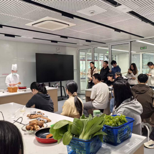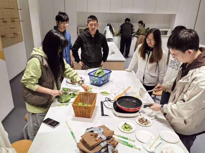 随后,大家带着新鲜的蔬菜走进厨房,在老师的指导下洗菜、切菜、下锅翻炒,热油滋滋作响,香气弥漫四周。当一盘盘带着烟火气的家常菜端上桌,同学们围坐分享,每一口都格外鲜香 —— 这不仅是味蕾的满足,更是对 “劳动创造价值” 最直观的感悟。