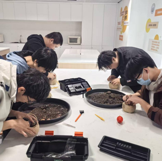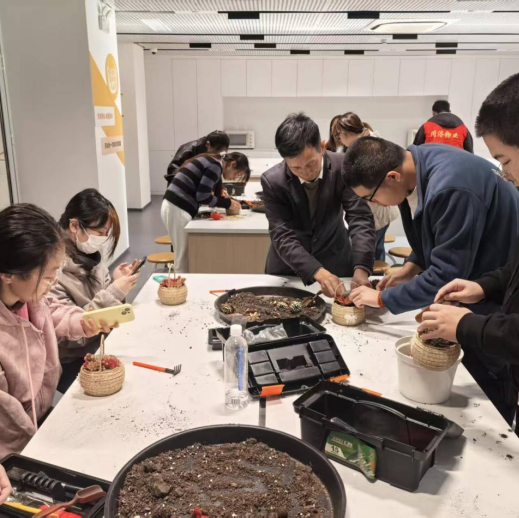 活动现场,一盆盆饱满翠绿的多肉、各式各样的花盆、松软的营养土整齐排列,瞬间唤起大家的创作热情。老师先介绍了多肉的品种、生长习性与栽种技巧,随后同学们便开始挑选心仪的多肉组合搭配。大家小心翼翼地填土、放苗、扶正、压实,每一个动作都饱含耐心与呵护。