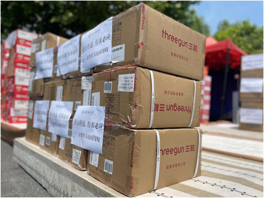 以上两笔捐赠得到龙头股份旗下三枪集团的大力支持,三枪不仅给予最大的优惠,还调配运力,第一时间将爱心物资运送到两校区。