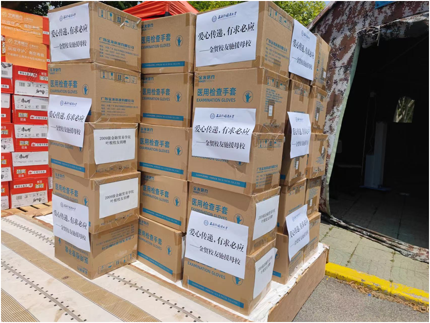 5月1日同时送达的爱心物资还有金贸学院叶根校友向两校区捐赠的医用手套10万只。