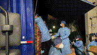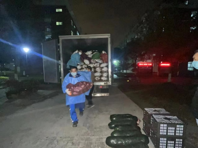 运送食材物资的卡车白天黑夜接踵而至。除了白天进货搬运外,经常有物资深夜到达。忙活了一整天的食堂大叔马上集结,加入到物资搬运队伍。消杀、卸货、分拣、搬运,师生们第二天的餐食由此而来。食堂叔叔阿姨们做好防护,撸起袖子就是干,有苦有泪不轻言。