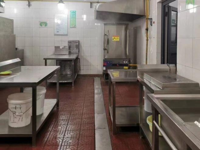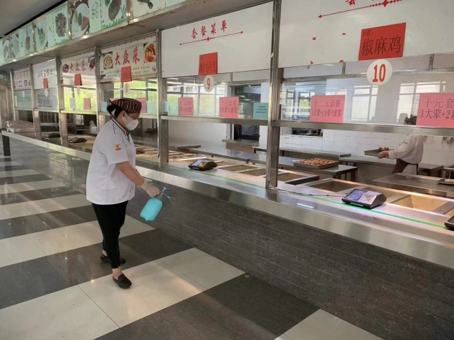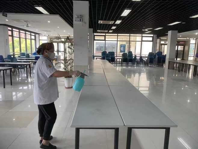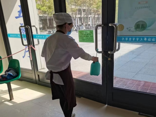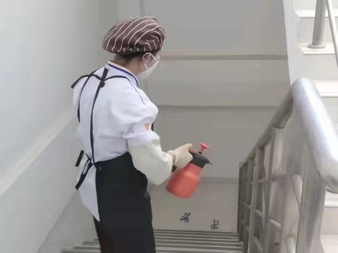 下午一点,食堂用餐渐渐进入尾声。清洗间里,所有的工用具在经过高温水冲洗消毒后,最终在完成高温灭菌后收入保洁柜。清洗间外,食堂叔叔阿姨们正对食堂大厅以及相关设施例行每日三次的消杀工作。