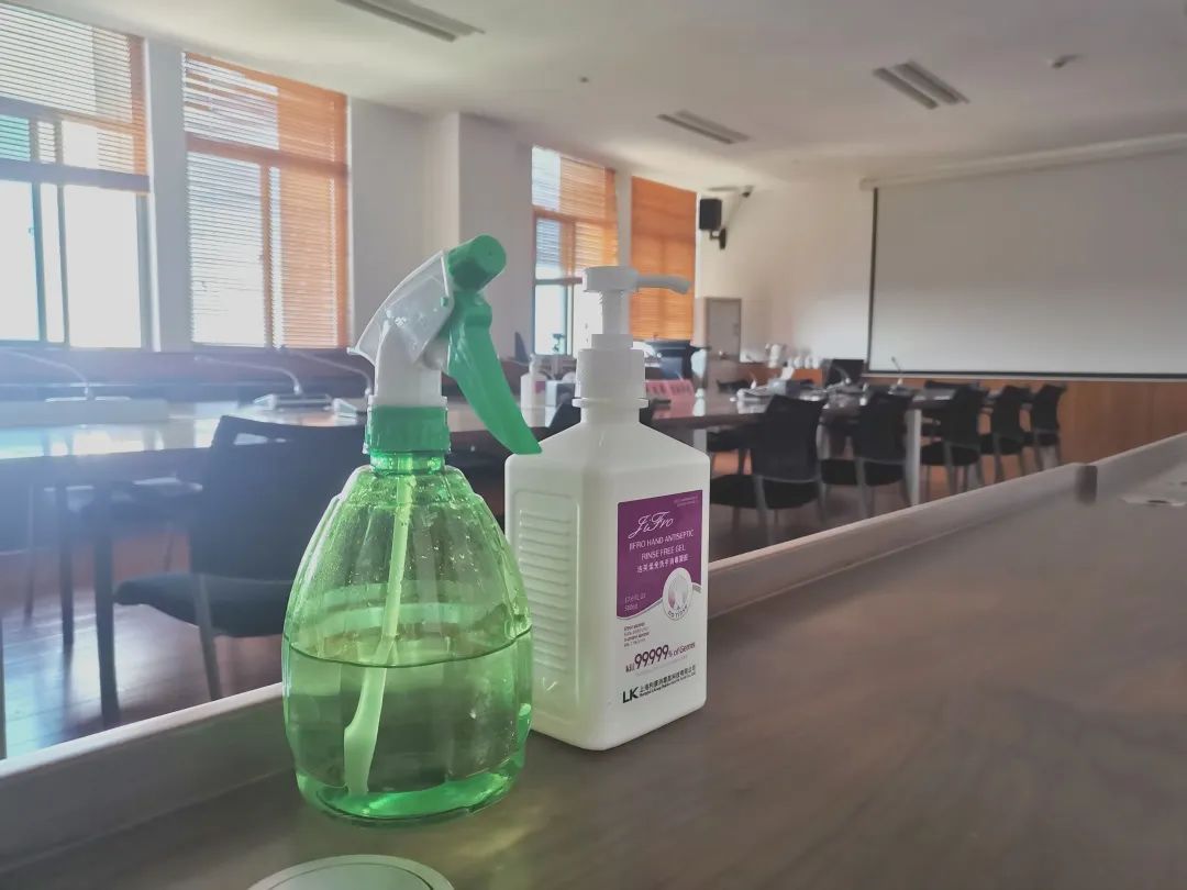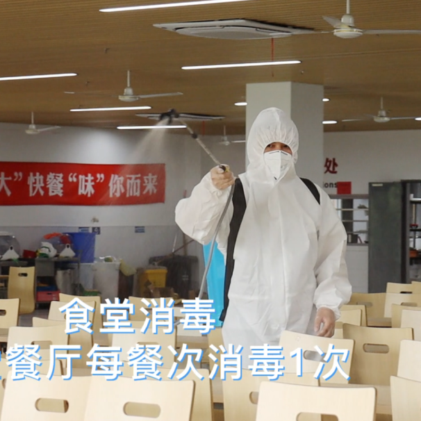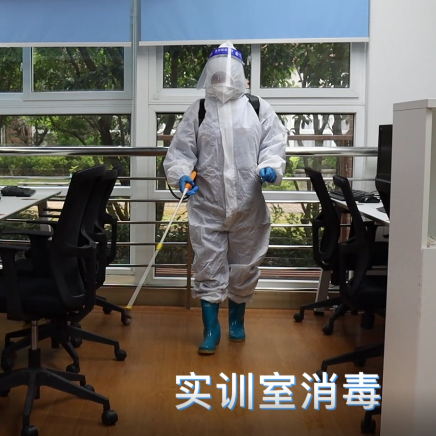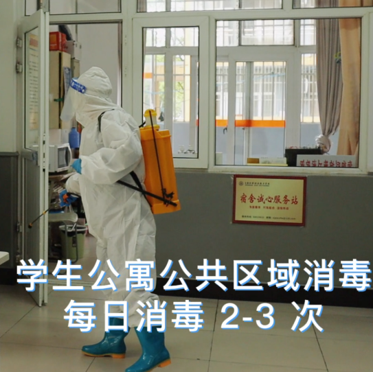 在校内所有开放使用的公共场所进行每日喷雾消毒和设施台面的擦拭消毒。主要使用 84 消毒液经对比稀释后喷雾消毒,使用酒精或稀释后的消毒液对设施台面进行擦拭消毒。消毒作业频次为学生公寓公共区域每日消毒 2-3 次,宿舍卫生内每周集中消毒 1 次;图书馆每日消毒 2 次,桌面每日消毒 3 次;食堂餐厅每餐次消毒 1 次;体育馆每次使用前后各消毒 1 次;有限开放使用的实训场地空间每批次使用结束后消毒 1 次。