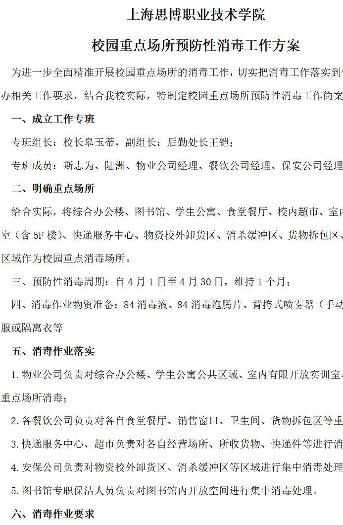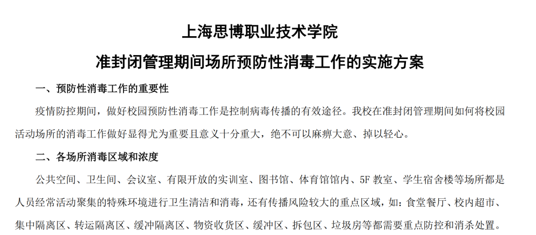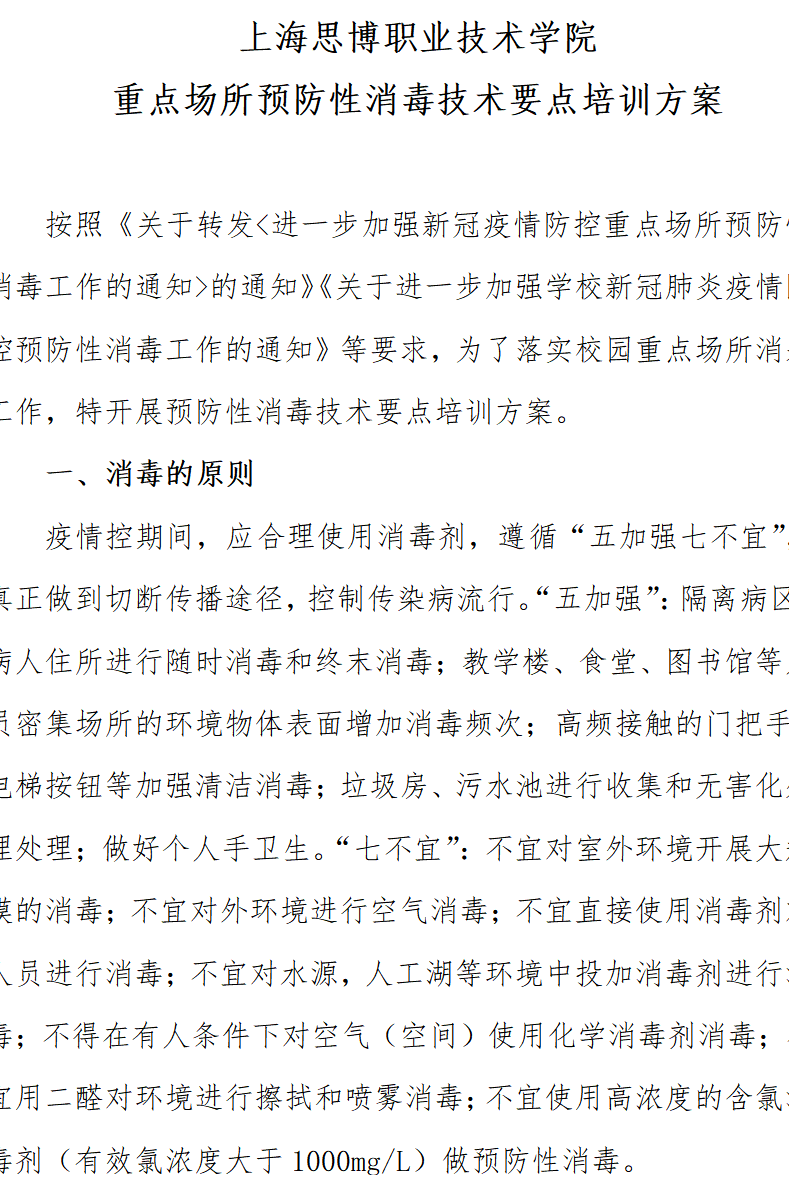 为了做好校园疫情防控工作, 我校先后制定了《校园重点场所预防性消毒工作方案》、《准封闭管理期间场所预防性消毒工作的实施方案》、《场所环境预防性消毒技术要点培训方案》,方案明确了消毒场所点位安排、消毒作业人员以及监督检查人员,明确了消毒作业规范和要求,明确了各场所点位消毒频次和浓度。通过工作方案制定和培训,使得校园环境场所的消毒工作更加科学和有效。