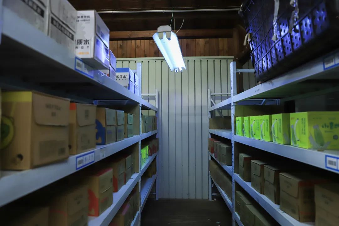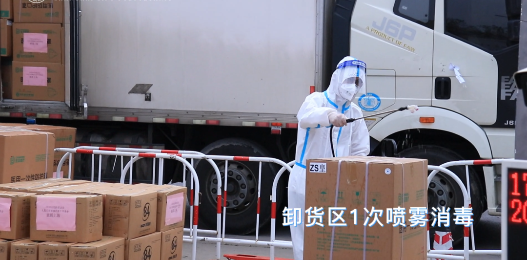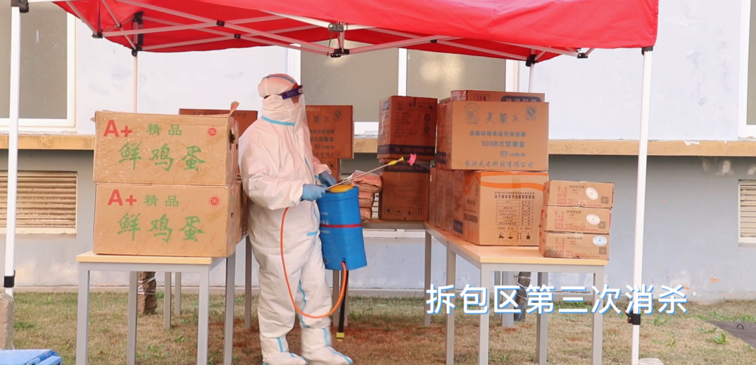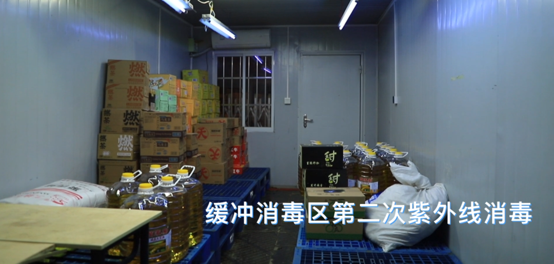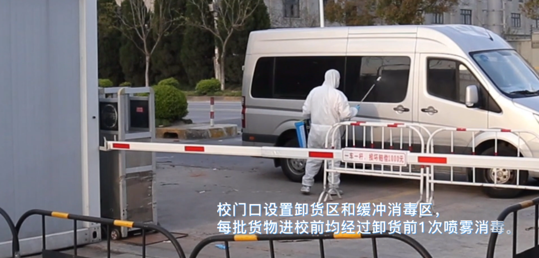 在校门口设置卸货区和缓冲消毒区,每批货物进校前均经过卸货前1次喷雾消毒,搬进密闭的缓冲消毒区后,经过紫外线灭菌灯消毒且作用30分钟以上,再由校内人员(穿一级防护装备)搬运短驳到户外设置的拆包区,在拆包区再经过细致的喷雾消毒,且作用3小时以上。物资经过“三重”的严格消杀处置后,方可由工作人员(穿二级防护装备)拆包搬运至室内,拆包后的外包装还需要进行集中消毒处置。校内超市内的货物还设置了存货区,在密闭的存货区内又安装了紫外线灭菌灯(臭氧性),再经过紫外线消毒作用后隔天方可上架销售。为了进一步强化商超货物的安全,消杀专班经过认真研判又在超市内加装了紫外线消毒灭菌灯,每批货物上架销售前均进行30分钟以上的消毒,确保每件货物的安全。