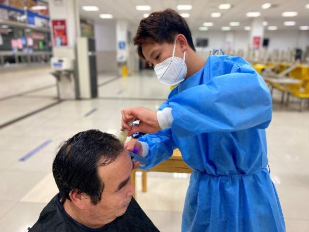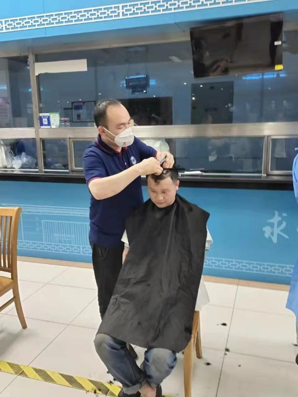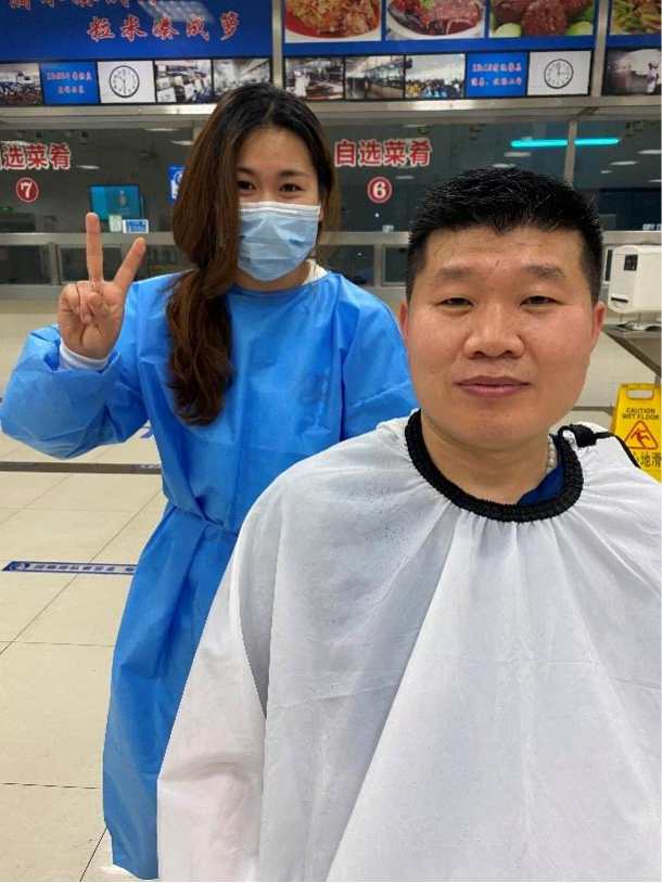 “我曾经在理发店工作,现在受到疫情影响,大家无法离校,我把压箱底的功夫再次拿出来,尽自己的一份力。”理发小组的小组长方凯迪一边为食堂阿姨理发,一边笑呵呵地说道。方凯迪是招待餐厅的一名一星服务明星,她一晚上花了3个小时的时间为14名员工理发,结束的时候,她腰酸背痛,却没有一句抱怨。她表示,既然周围的同事们需要自己的帮助,就应该勇敢地站出来向大家伸出援手,为大家解燃眉之急。