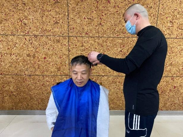 山明三楼清真餐厅的餐厅经理米瓦哈卜一直对理发挺感兴趣,平时也喜欢自己给自己理发,没想到这次自己“自学成才”的本领派上了大用场。“我的手艺只能局限于给男同志理个平头,技术一般,还请大家多多包涵啊。”在米经理看来,自己的水平不如理发小组的其他成员,便主动揽过了所有“板寸头”的理发任务。每次组队理发,米经理都是第一个到,最后一个走。