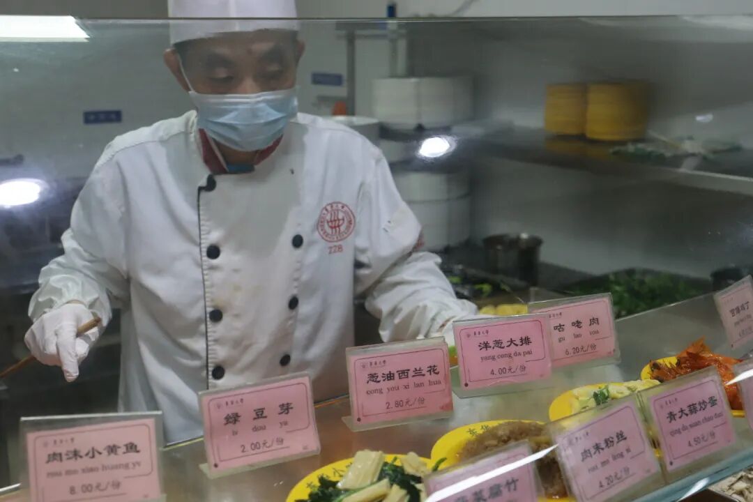 “我来东华大学应该有31年了,那个时候还叫纺织大学呢。在一食堂二楼卤菜馆也有十几年了,时间过得真快。在这期间我也一直在研究学习各种菜系,了解师生员工的口味,不断变化菜系口味,尽量满足师生的口味。”