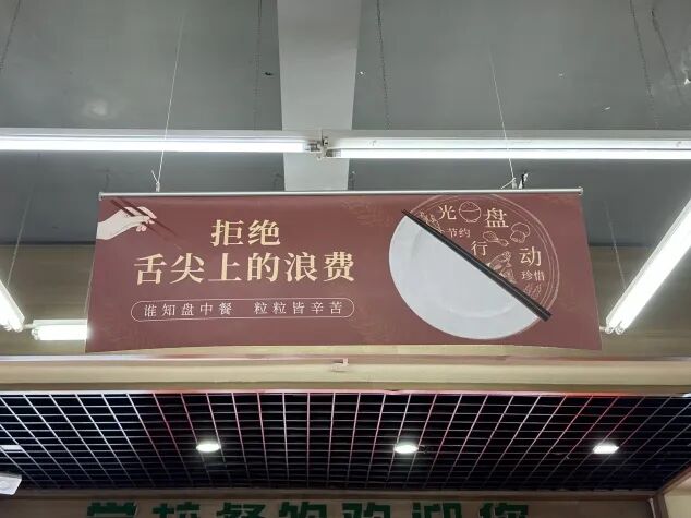 发布了《践行“光盘行动”倡议书》,并在食堂关键位置设置“拒绝浪费”、“光盘行动”等醒目提示标识和海报,时刻提醒师生按需取餐。