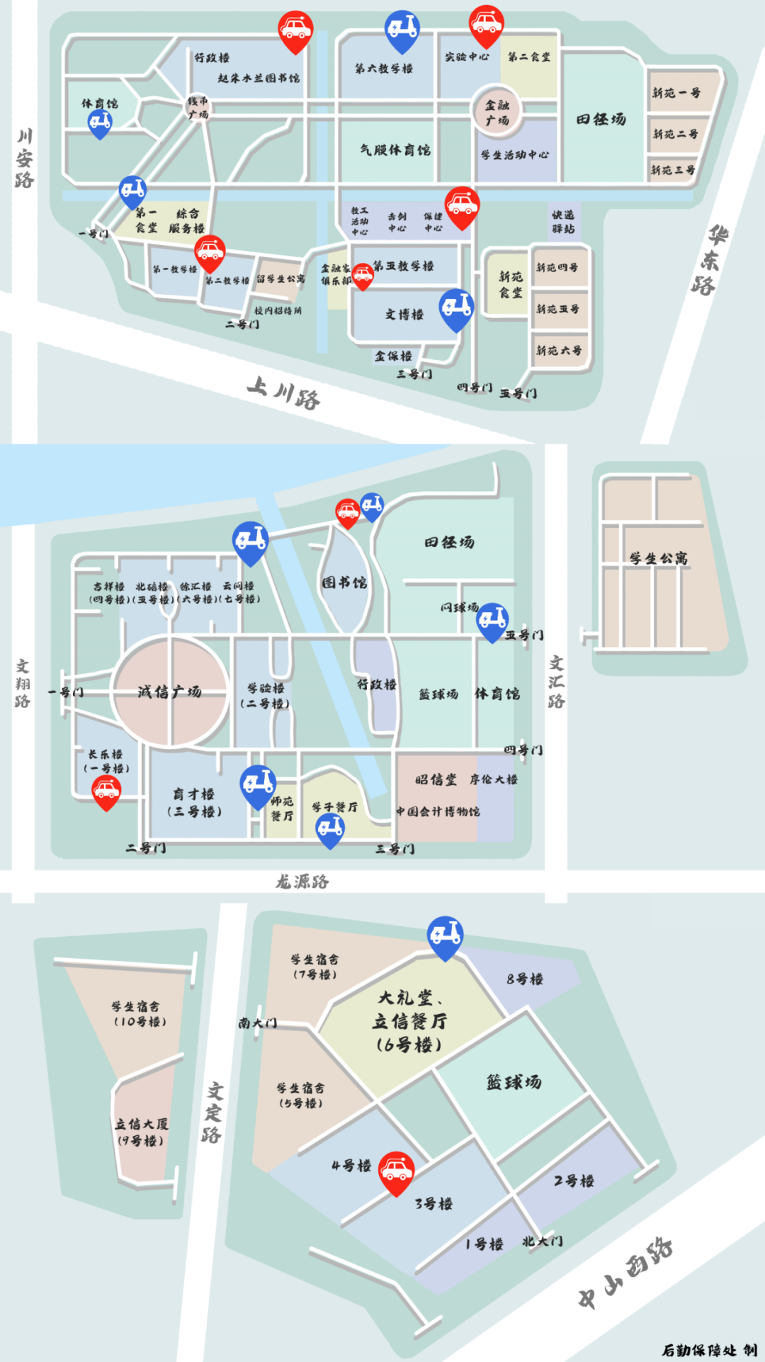注:三校区车辆充电地图随时可至本公众号消息界面,在底部菜单点击【住行】→【车辆充电】便捷获取哦。
