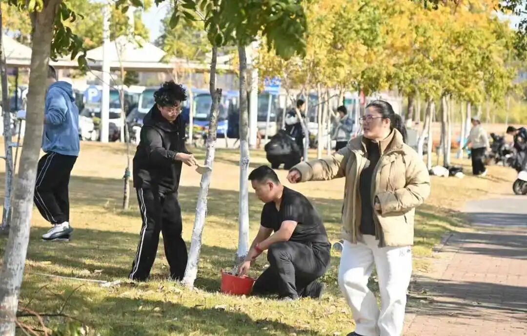 有的同学负责搅拌涂白剂,确保配比均匀;有的仔细清理树干基部的枯枝杂草;还有的蹲在树旁,将涂白剂均匀地刷在树干上,从根部到一米高处,不留死角。虽然袖口和手套沾了不少白色涂料,但看着一排排树木穿上整齐的“白外套”,大家脸上都洋溢着成功的喜悦!