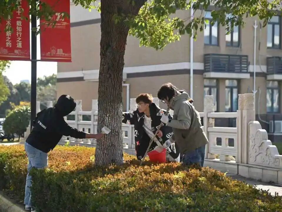 活动开始前,指导老师先为同学们讲解了树木刷白的专业知识:刷白剂中的生石灰能杀菌除虫,消灭树皮缝隙里越冬的病菌虫卵;白色涂层还能反射阳光,降低树干昼夜温差,避免冻裂损伤。听完讲解,同学们迅速分组,拎起水桶、拿起毛刷,有条不紊地投入劳动实践中。