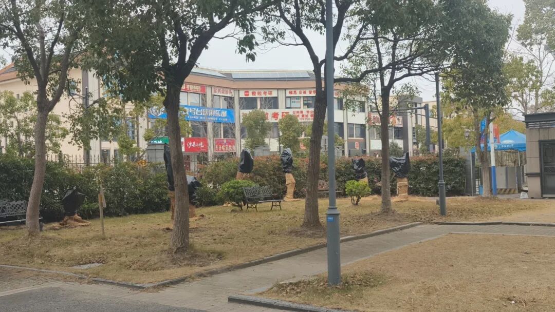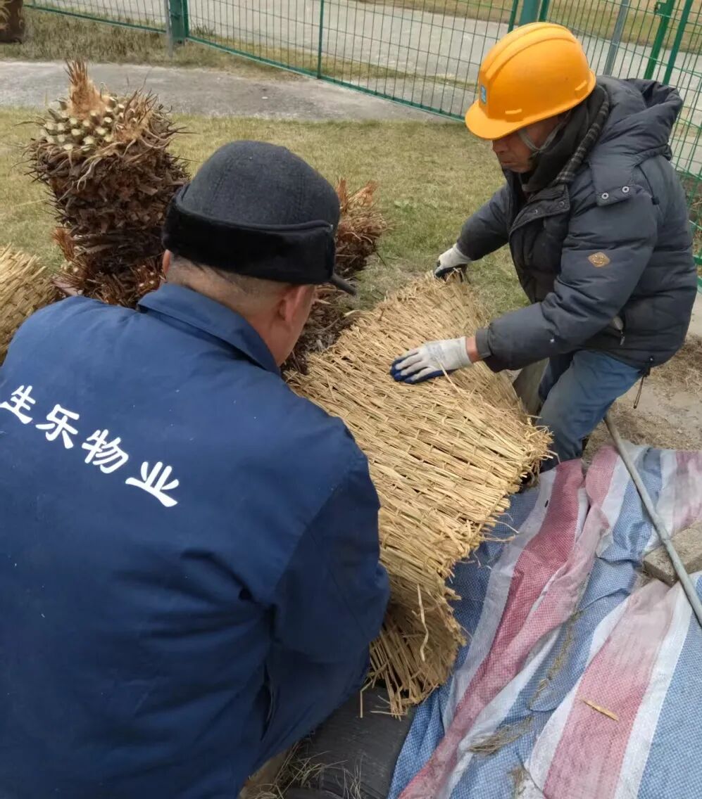 苏铁等不耐寒的绿植,今日都穿上了厚厚的 “草衣”。师傅们仔细为每一株植株包裹草帘,拉紧绳结,让这些陪伴师生四季的绿植能安稳度过寒潮。