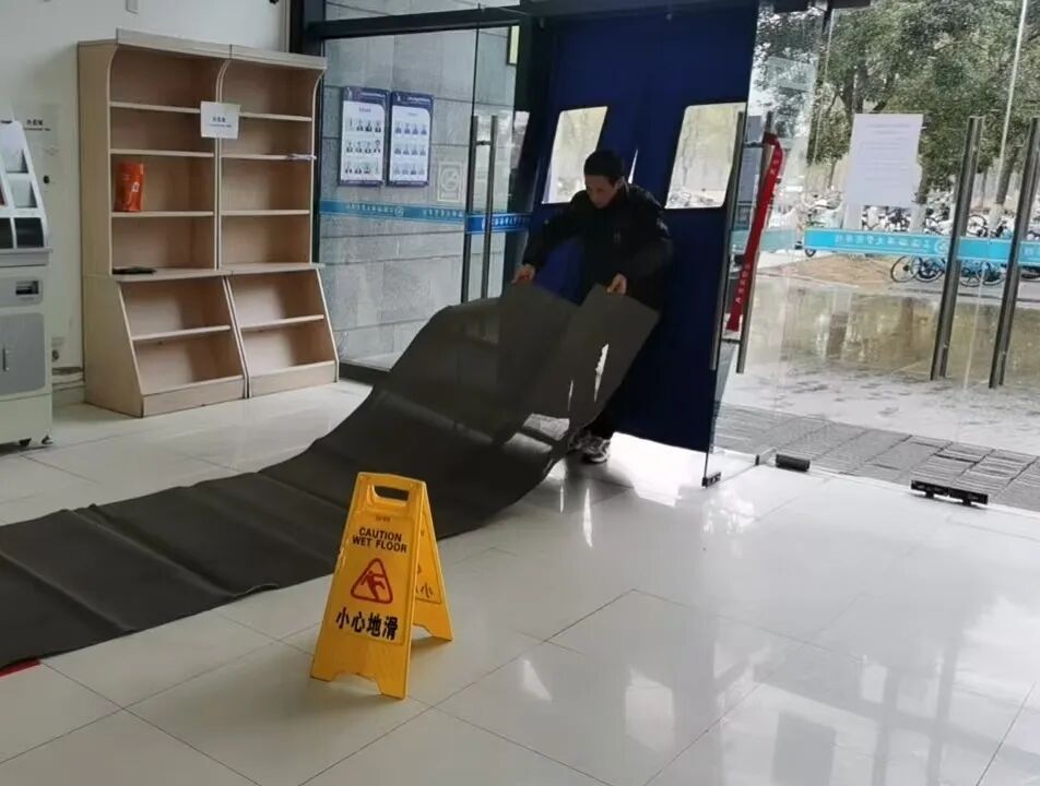除了户外坡道,我们也对室内做好了防滑保障。在大厅、楼道等易滑区域,已铺设防滑地垫,并摆放“小心地滑”警示标识。工人师傅也增加了巡检频次,及时擦干水渍,为师生筑牢从室外到室内的安全防线。