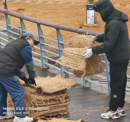 苏铁等不耐寒的绿植,今日都穿上了厚厚的 “草衣”。师傅们仔细为每一株植株包裹草帘,拉紧绳结,让这些陪伴师生四季的绿植能安稳度过寒潮。