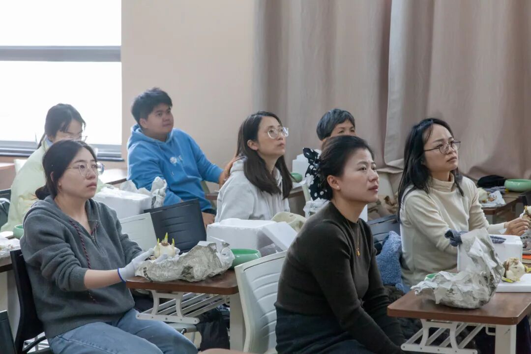 作为沪上知名的“禅意派”水仙雕刻大师,张瑜老师擅长以独特的雕刻手法融合自然与人文,其作品兼具艺术观赏性与思想深度。活动伊始,张老师以生动的语言为师生们科普了水仙的生长习性和文化内涵。作为传统观赏花卉,水仙在中国的栽培历史长达千年,承载着深厚的文化底蕴,“崇明水仙传统栽培技艺”更被列入上海市非物质文化遗产名录。随后,张老师结合实物演示,详细拆解了水仙花雕刻的关键步骤:从净化鳞茎、开盖疏隙,到剥苞削叶、刮梗修整,每一个环节的力度把控、角度选择都讲解得细致入微,让原本对雕刻技艺感到陌生的师生们豁然开朗。