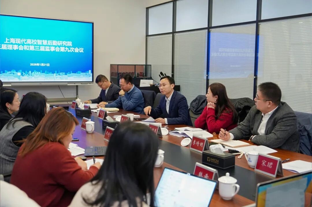 2026年1月21日,上海现代高校智慧后勤研究院召开第三届理事会第九次会议。市教委学校后勤保卫处处长贺小虎、副处长毛岚,市民政局社会化服务机构管理处处长马继东,研究院理事会、监事会成员及研究院工作人员参加会议,研究院院长、副理事长魏建军主持会议。